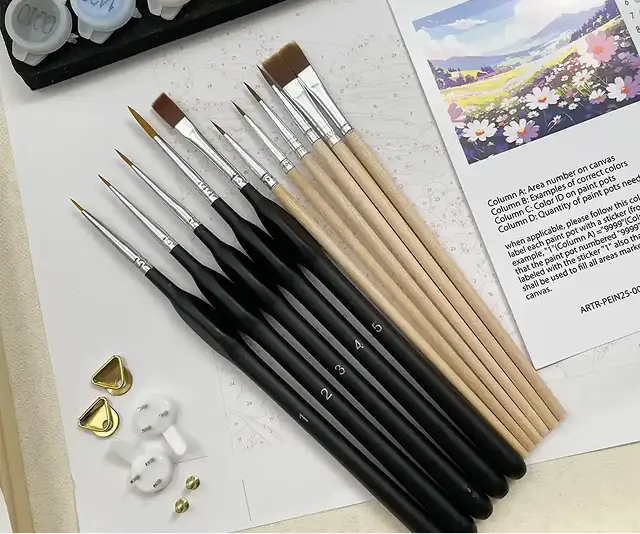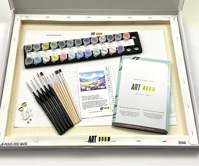Complete kit: frame, acrylic paints, step-by-step guide, hook, 11 premium brushes